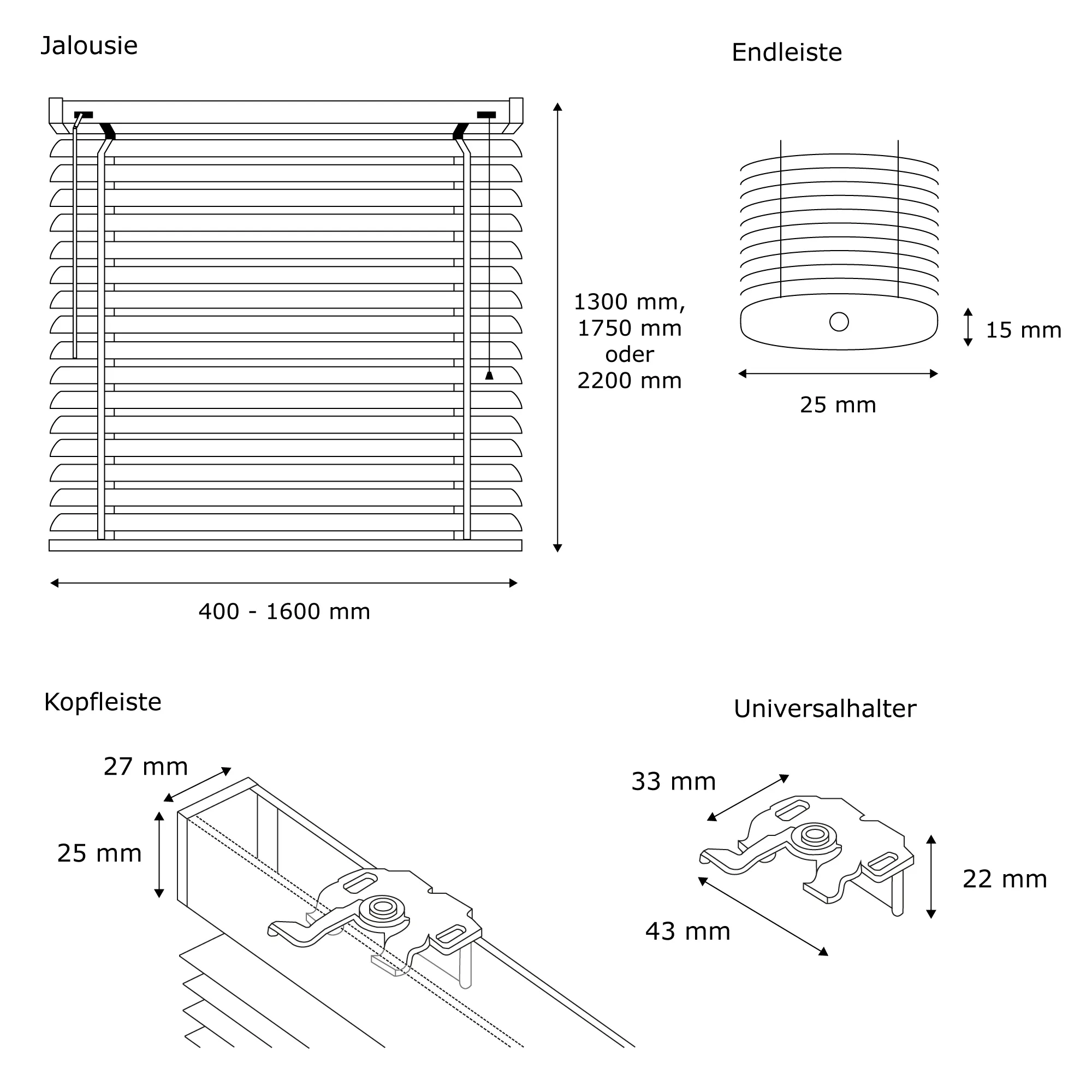 Alle Teile unserer Standard-Jalousien werden maschinell hochwertig gefertigt. Angefangen bei Schnurzug und Wendestab, welche auf bis zu 10. 000 Zyklen getestet wurden, über die stabilen Universalhalterungen aus Metall, bis hin zu den sehr flexiblen, aus hochwertigem Aluminium bestehenden 25-mm-Lamellen. Du erhältst von uns ein von Anfang bis Ende durchdachtes Produkt.