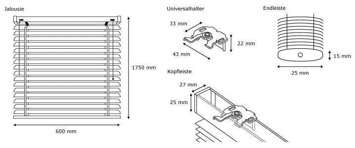 Alle Teile unserer Standard-Jalousien werden maschinell hochwertig gefertigt. Angefangen bei Schnurzug und Wendestab, welche auf bis zu 10. 000 Zyklen getestet wurden, über die stabilen Universalhalterungen aus Metall, bis hin zu den sehr flexiblen, aus hochwertigem Aluminium bestehenden 25-mm-Lamellen. Du erhältst von uns ein von Anfang bis Ende durchdachtes Produkt.