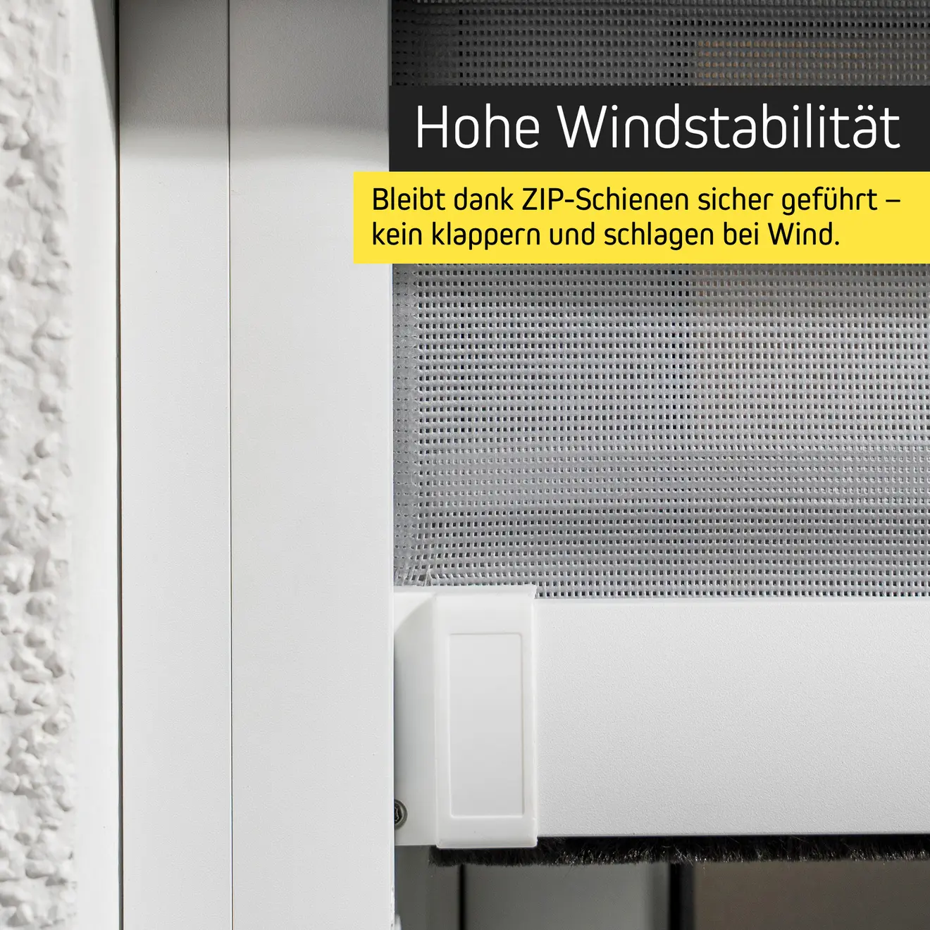 Das Besondere an unserem Zip-Screen ist die seitliche Führungsschiene mit integriertem Reißverschluss-Prinzip. Dadurch wird das Gewebe sicher in Position gehalten – es klappert oder schlägt nicht bei Wind. Du kannst dich entspannt zurücklehnen. Unser Zip-Screen wurde ausgiebig getestet und erfüllt die Windwiderstandsklasse 3, was der Windstärke 6 (starker Wind) entspricht.