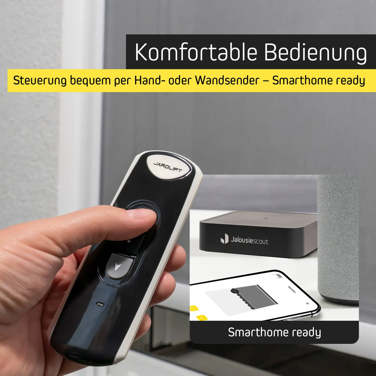 Dein Zip-Screen wird mit unseren eigenen Motoren ausgestattet, die sich bereits über 400.000-mal auf dem Markt bewährt hat. Die Bedienung erfolgt bequem per Hand- oder Wandsender. Wenn du es noch smarter magst, lässt sich das System problemlos in unser Jalousiescout Smarthome-System einbinden.