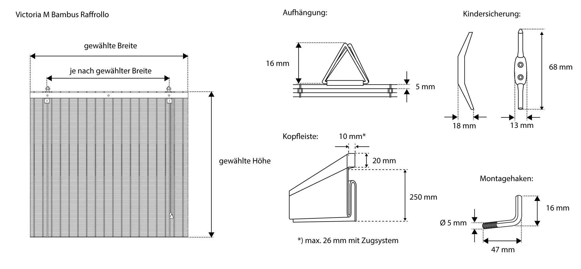 Natürliche Stoffe besitzen keine ausgeprägten physikalischen Eigenschaften, die moderne künstliche Fasern haben. Oben verläuft der Behang zwischen zwei stabilen Bambusoberschienen. Auf diesen Schienen sind die Teile des Zugmechanismus sowie doppelte Dreiecksösen zur Aufhängung befestigt. Die Verschnürung verläuft auf der Rückseite rechts und links durch jeweils fünf Ringe, die auf dem Bambus-Behang befestigt sind. Das Bambus-Raffrollo lässt sich so sehr leicht steuern, da der Zugmechanismus sehr einfach aufgebaut ist. Der Seitenzug befindet sich rechts.