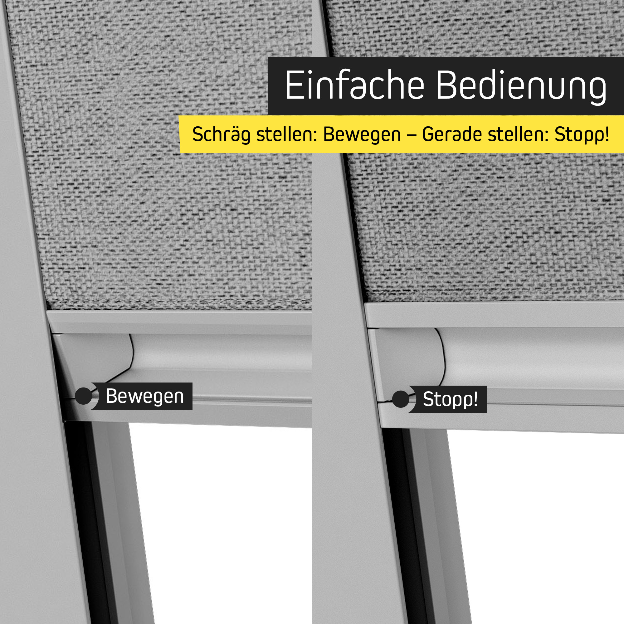 Das Dachfensterrollo überzeugt durch seine besonders einfache und komfortable Bedienung. Durch leichtes Kippen des unteren Profils lässt sich der Rollo mühelos und leichtgängig in der Führungsschiene verschieben. Wird das Profil wieder gerade gestellt, arretiert der Rollo automatisch und bleibt sicher in der gewünschten Position. So ermöglicht er eine stufenlose Einstellung für den gewünschten Lichteinfall.