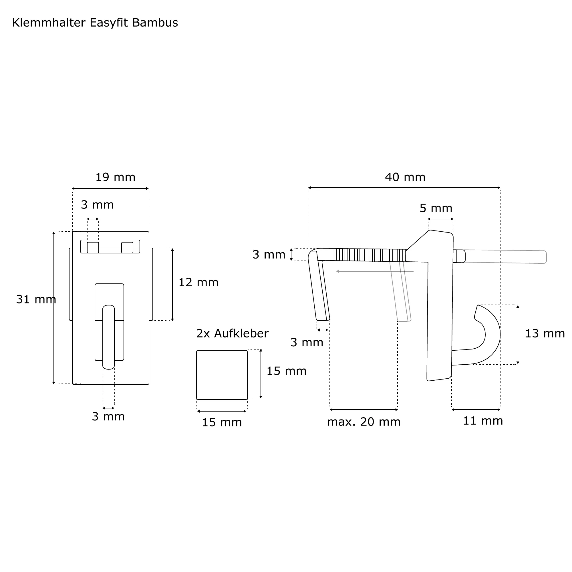 Verwende unsere VICTORIA M Klemmhalter Easyfit Bambus nicht nur für unsere Bambusrollos, sondern auch alle anderen Sonnenschutz-Produkte die mittels Dreiecksöse befestigt werden können. Du erhältst die Klemmhalter Easyfit Bambus in weiß zum Einhängen am Fenster- bzw. Türflügel jeweils als 2er o. 3er Set inklusive Befestigungsmaterial (Klebestreifen).