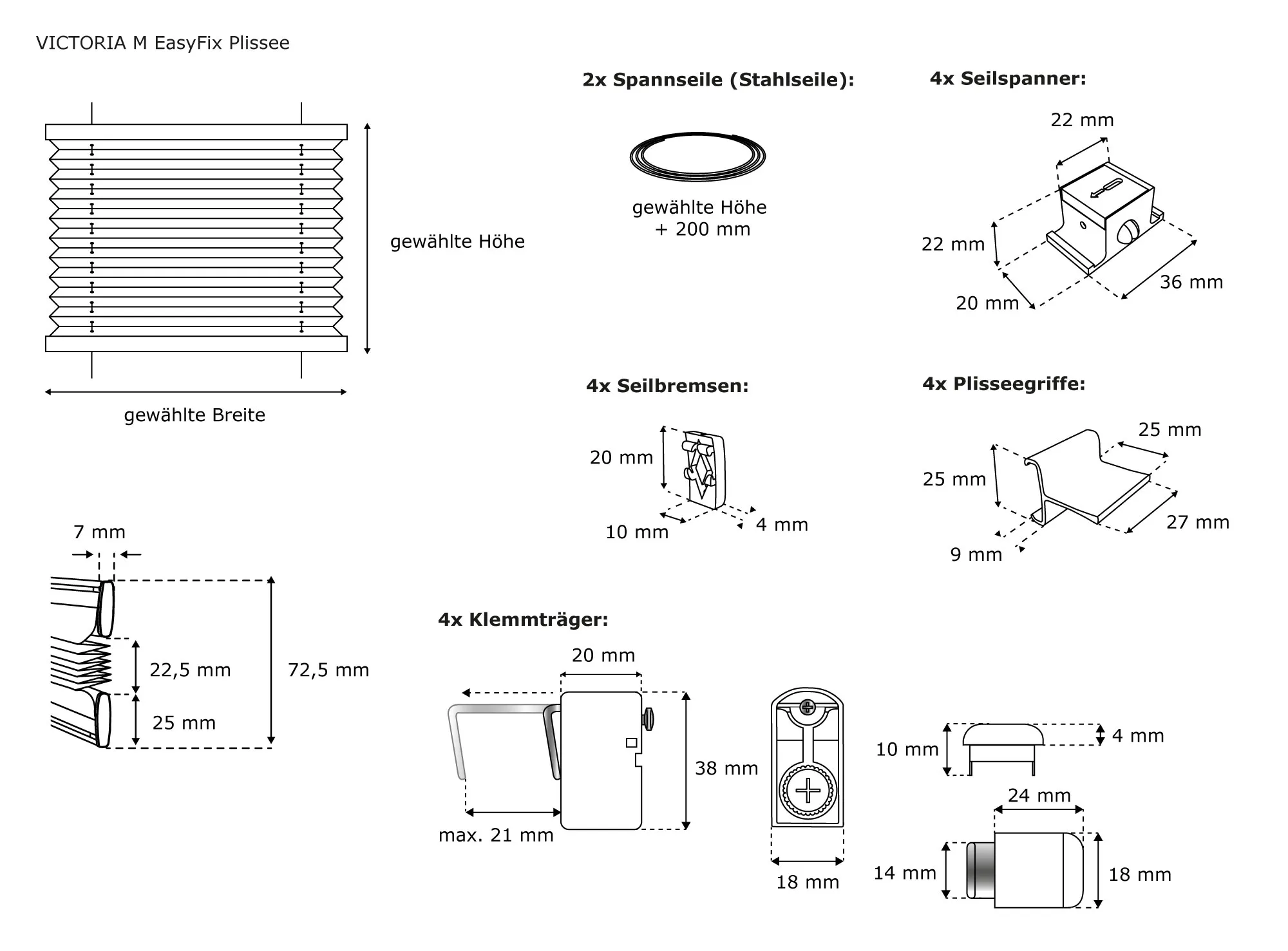 Die Montage funktioniert mit Hilfe von praktischen Klemmhaltern, die auf dem Fensterrahmen aufgesteckt werden. Fädle die Plisseeseile einfach in die Klemmhalter ein und bringe zuletzt noch die Seile auf Spannung. Fertig! Bitte beachte dabei, dass der Fensterflügel min. 9 mm und max. 21 mm Stärke haben darf.