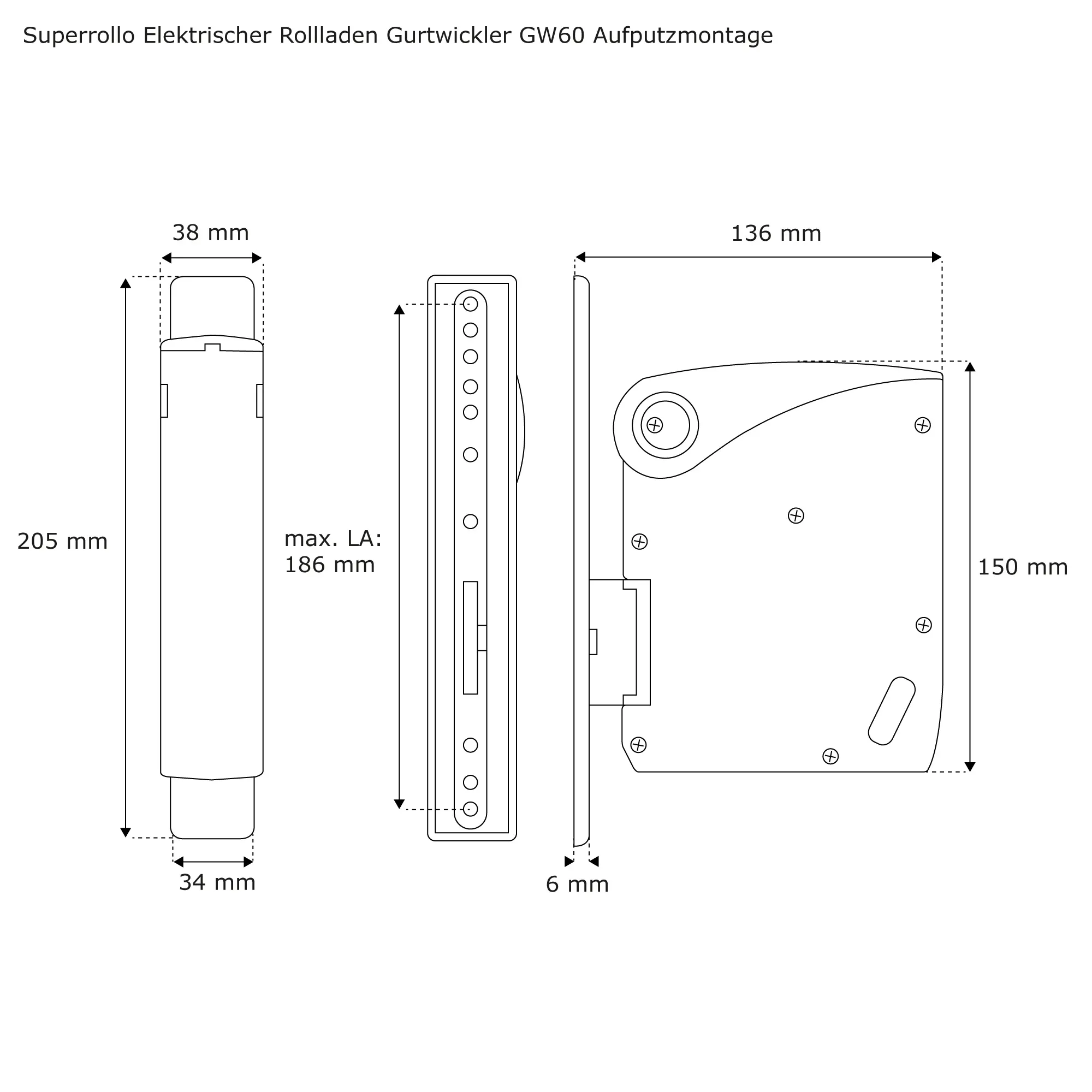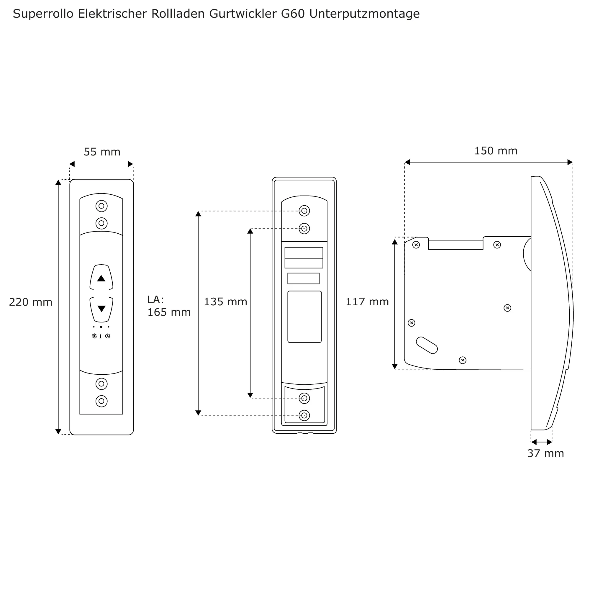 Bei der Montage Unterputz wird einfach die im Lieferumfang enthaltene Blende auf das Gerät aufgesteckt. Der SUPERROLLO GW60 passt dann in jeden handelsüblichen Gurtkasten mit Lochabstand 135 mm, 150 mm oder 165 mm.