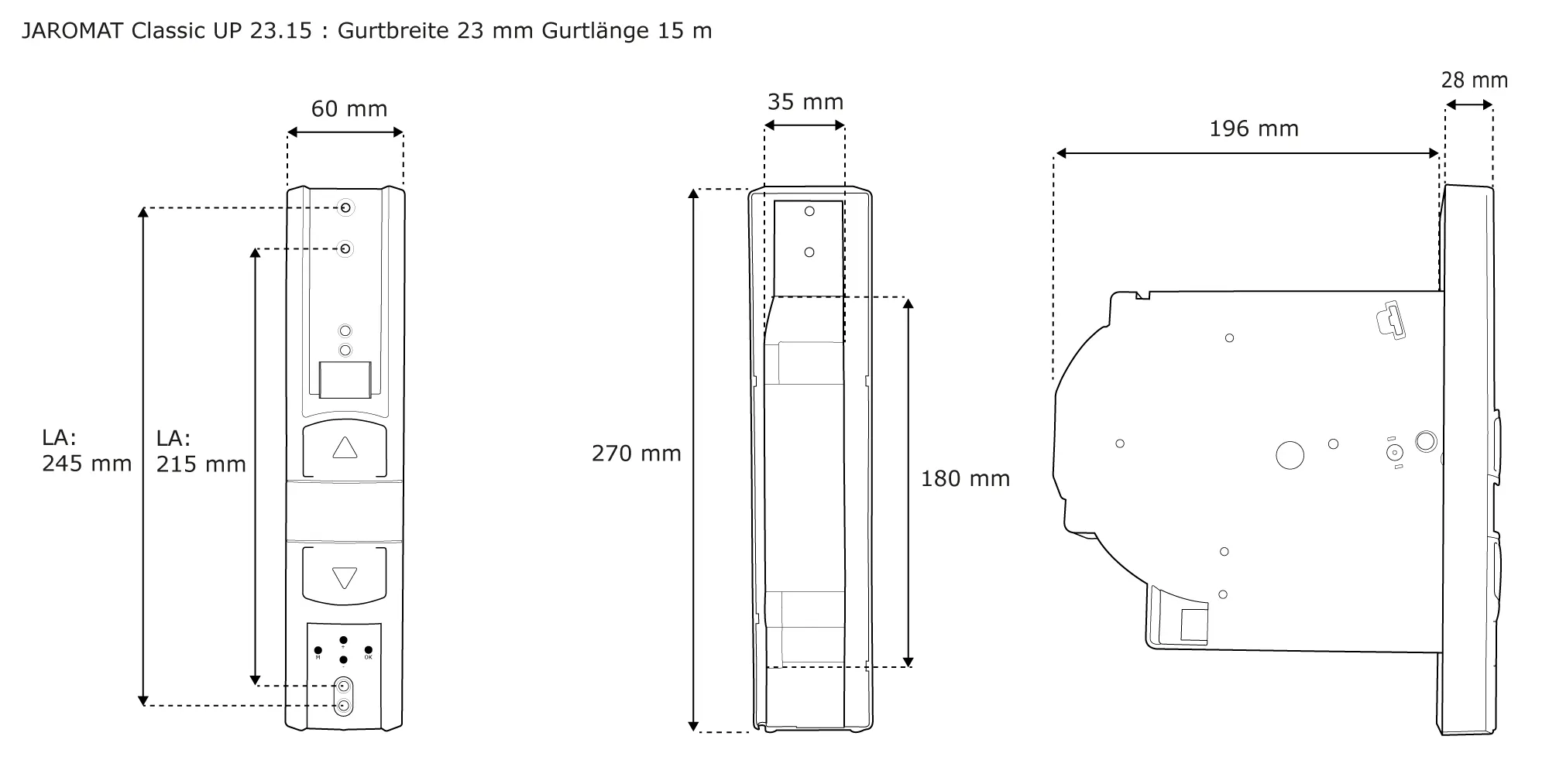 | Produktbezeichnung: | Elektrischer Gurtwickler JAROMAT Classic | UP 23/15 / weiß / 23 mm Gurtbreite |