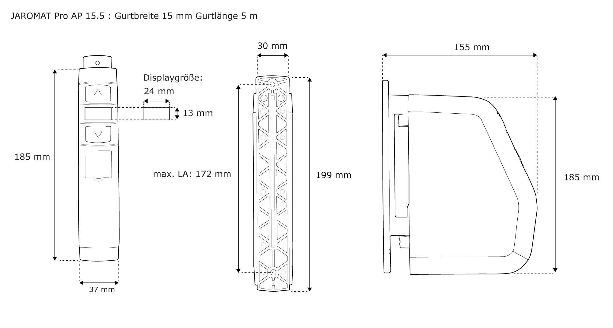 | Gurtlänge (Wickelkapazität): | 4 m (Gurtbandstärke 1,3 mm), 5 m (Gurtbandstärke 1,0 mm) |