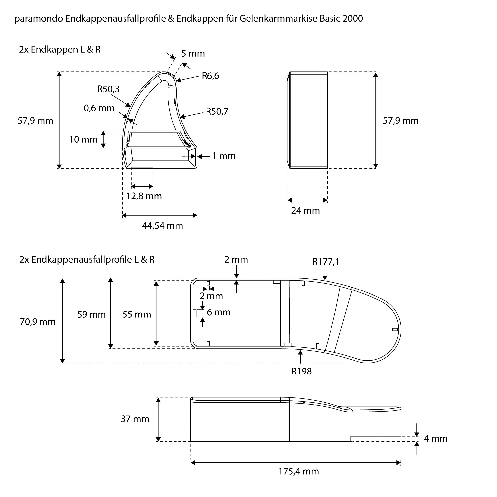 Mache deine Basic 2000 auch optisch zum Hingucker. Mit den Endkappenausfallprofilen und Endkappen sorgst du für einen sauberen Abschluss von Ausfallprofil und Kassette. Das Set besteht aus Endkappenausfallprofilen und Endkappen für die rechte und linke Markisenseite. Sie sind in der Farbe Weiß erhältlich.
