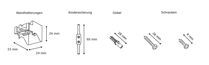 Durch den täglichen Gebrauch und Materialbelastungen können im Laufe der Zeit einzelne Bestandteile deines Raffrollos Schaden nehmen. Oder aber, man zieht in eine neue Wohnung und stellt erst bei der Montage fest, dass nicht mehr alle Teile vorhanden sind. Aber gleich ein komplett neues Raffrollo kaufen, weil z.B. eine Raffrollo-Wandhalterung beschädigt oder verloren gegangen ist? Das muss nicht sein. Mit unserem Raffrollo-Ersatzteil-Set kannst du diesen kleinen Schaden an deinem Raffrollo im Handumdrehen selbst beheben. Die Sicherheit deiner Kinder ist uns wichtig! Deshalb liegt jedem unserer VICTORIA M Raffrollo-Ersatzteil-Sets von Haus aus eine Kindersicherung / Sicherheitshalterung für die Zugschnur bei. Somit können sich deine Kleinen beim Spielen nicht darin verfangen und schlimmstenfalls strangulieren. Mit diesem Ersatzteil-Set für Raffrollos erhältst du zum Austausch zwei Wandhalterungen und eine Kindersicherung zum Sichern der Zugschnur. Im Set ebenfalls enthalten sind auch die zur Montage notwendigen Befestigungsschrauben und Dübel.
