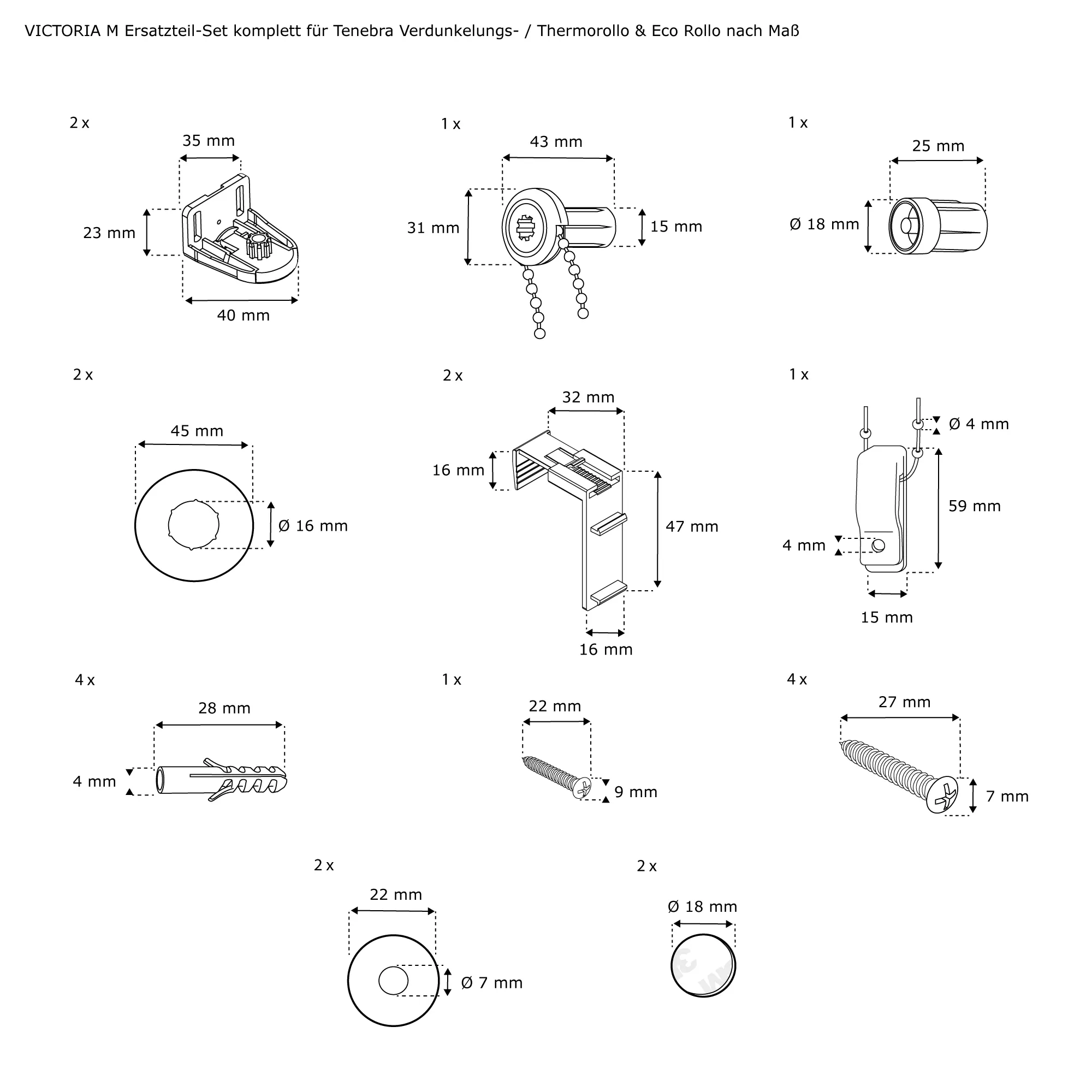 | Produktbezeichnung: | Ersatzteil-Set komplett für Tenebra Verdunkelungs- / Thermorollo & Eco Rollo nach Maß |
