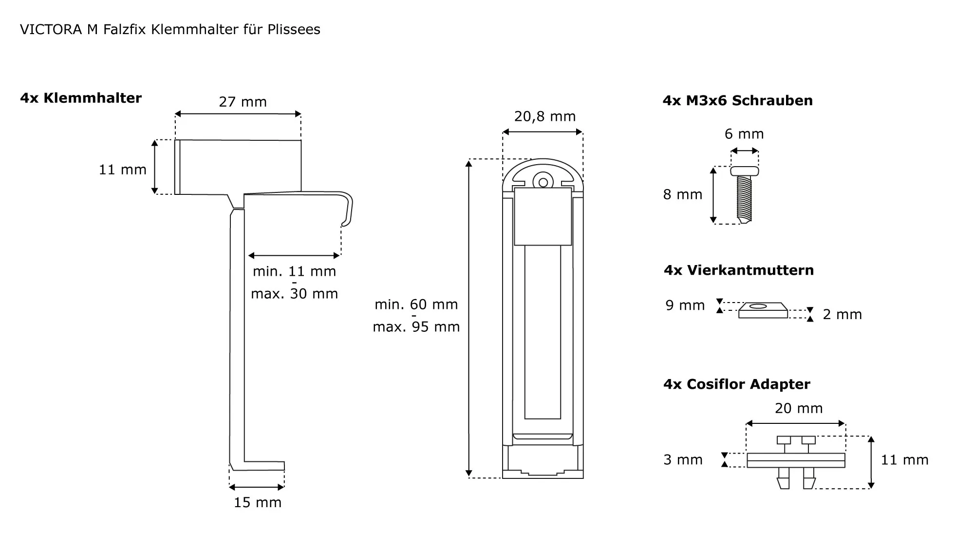Deine Plissees sind zu kurz, da du die falsche Länge bestellt hast? Das ist nicht schlimm. Wir haben die Lösung: Unsere Falzfix Klemmhalter für Plissees gleichen die fehlende Länge aus. Mit ihnen kannst du jeweils 6 bis 9,5 cm nach oben und unten gewinnen. Die Klemmträger passen für Plissees auf Maß der Marken Cosiflor, Delphos und Marie Lang sowie für Standard Crush- und Wabenplissees von VICTORIA M. Die Montage ist ganz einfach. Der Klemmhalter selbst wird auf dem Fensterflügel befestigt, und das Plissee verläuft dann innerhalb der Fensterfalz. Bitte beachte hierbei, dass die Falztiefe mindestens 15 mm betragen muss und dass die Anbringung nur auf Kunststofffenstern möglich ist – bei einer Flügelbreite zwischen 1 und 3 cm. Unsere Klemmhalter bekommst du in Weiß, Grau, Braun und Schwarz.