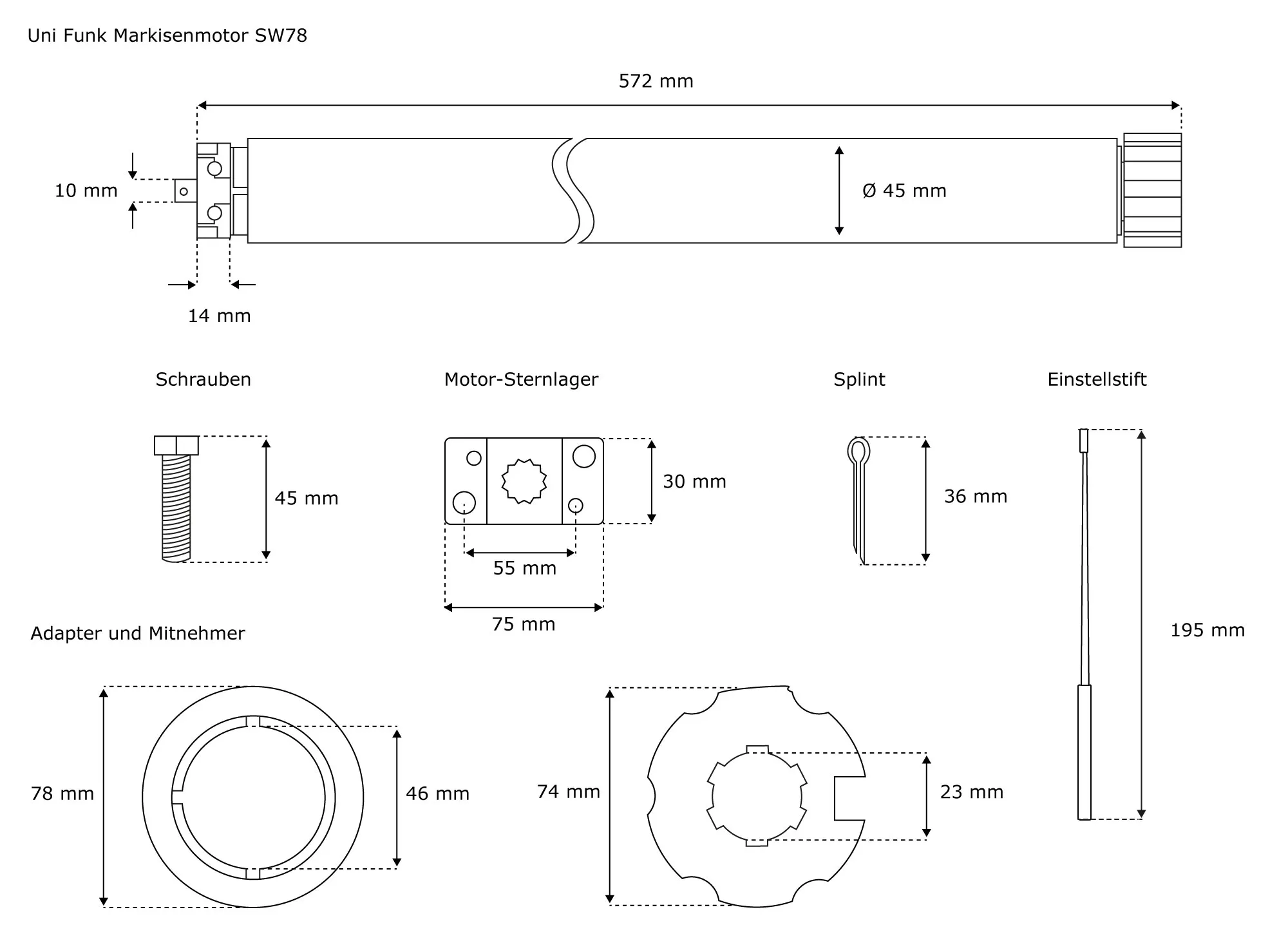 | Produktbezeichnung: | Funk-Markisenmotor Universal | UNI78F (50 Nm / SW78) + Nutwellen-Adapter 70 mm |