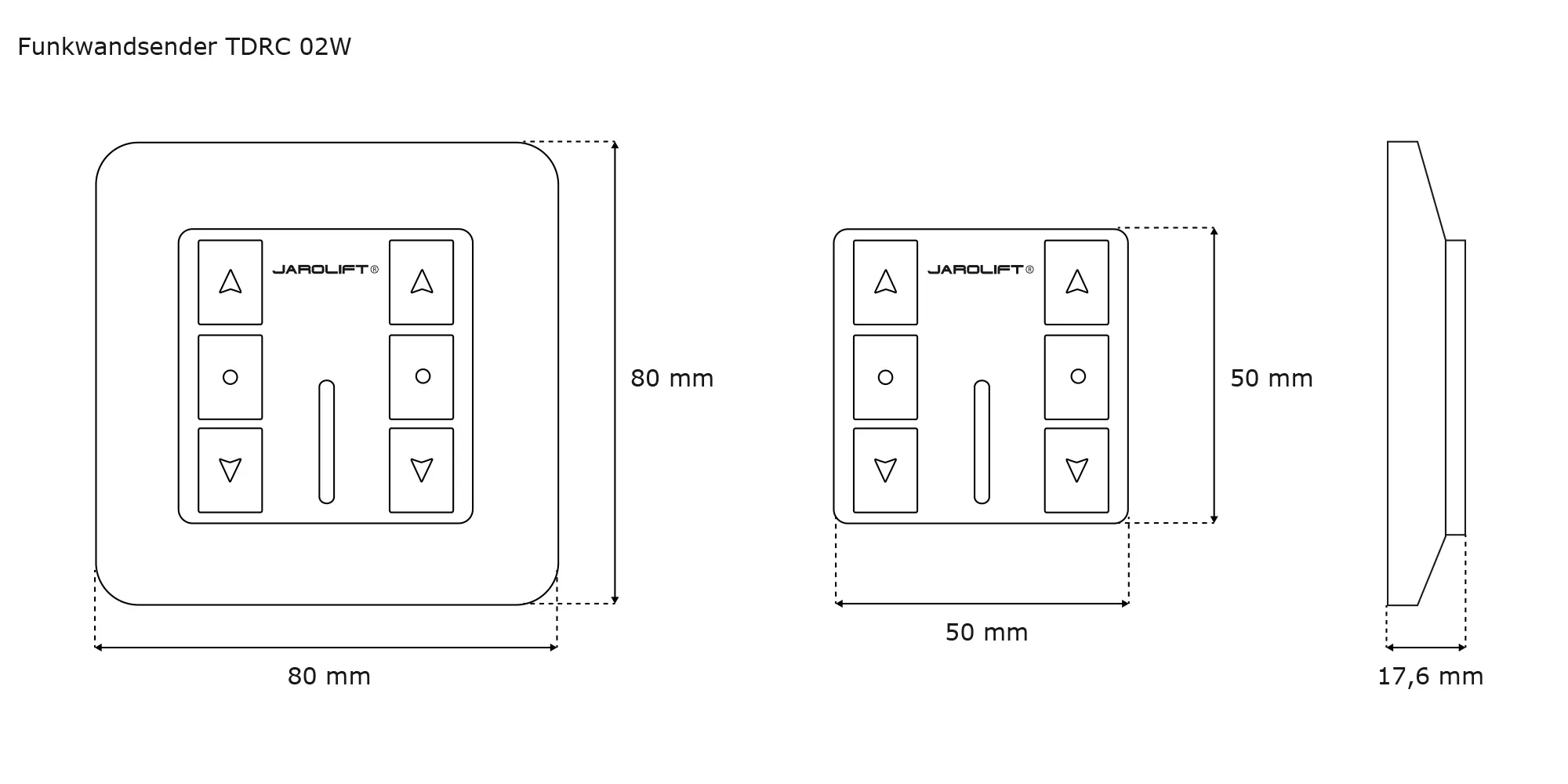 Mit unseren JAROLIFT®™ Funk-Wandsendern kannst du alle JAROLIFT®™ TDEF Funkmotoren sowie Funkempfänger vom Typ TDRR fernbedienen. Zudem können an allen TDEF Funkmotoren auch die Endpunkte einprogrammiert werden. Die in edlem Design hergestellten Funkwandsender der TDRC-Serie werden mit einem passenden Einfachrahmen ausgeliefert. Das Funkmodul wird im Rahmen mit Hilfe eines unsichtbaren Magneten festgehalten. Dadurch kannst du das Funkmodul aus dem Einzelrahmen entfernen, es als mobilen Handsender nutzen und später einfach wieder einsetzen. Das Funkmodul wurde in den Maßen 50 x 50 mm gehalten und lässt sich dank eines DIN Zwischenrahmen in alle gängigen Schalterprogramme wie z.B. Gira, Merten, Busch u. Jaeger, Kopp, etc. integrieren. Das kontrastreiche Display und die roten LED Markierungen runden das hochwertige, zeitlose Design ab.