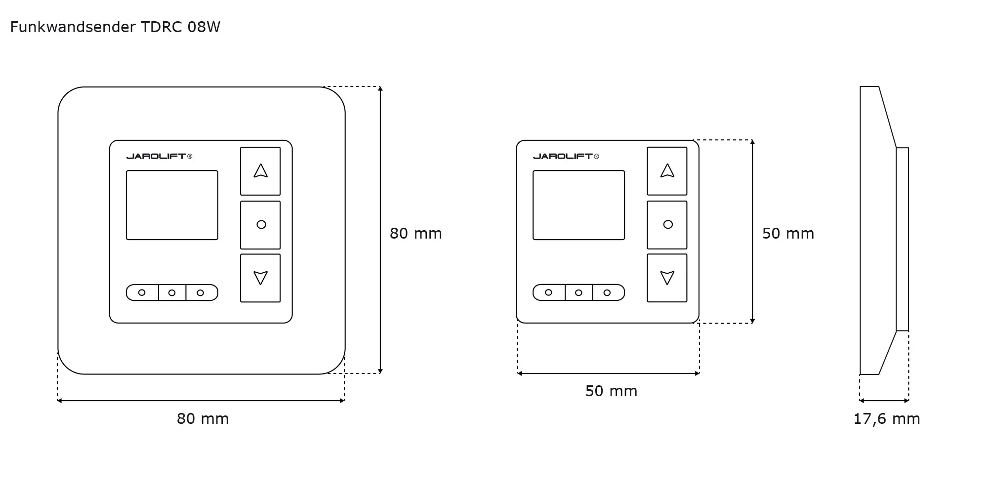 Mit unseren JAROLIFT®™ Funk-Wandsendern kannst du alle JAROLIFT®™ TDEF Funkmotoren sowie Funkempfänger vom Typ TDRR fernbedienen. Zudem können an allen TDEF Funkmotoren auch die Endpunkte einprogrammiert werden. Die in edlem Design hergestellten Funkwandsender der TDRC-Serie werden mit einem passenden Einfachrahmen ausgeliefert. Das Funkmodul wird im Rahmen mit Hilfe eines unsichtbaren Magneten festgehalten. Dadurch kannst du das Funkmodul aus dem Einzelrahmen entfernen, es als mobilen Handsender nutzen und später einfach wieder einsetzen. Das Funkmodul wurde in den Maßen 50 x 50 mm gehalten und lässt sich dank eines DIN Zwischenrahmen in alle gängigen Schalterprogramme wie z.B. Gira, Merten, Busch u. Jaeger, Kopp, etc. integrieren. Das kontrastreiche Display und die roten LED Markierungen runden das hochwertige, zeitlose Design ab.