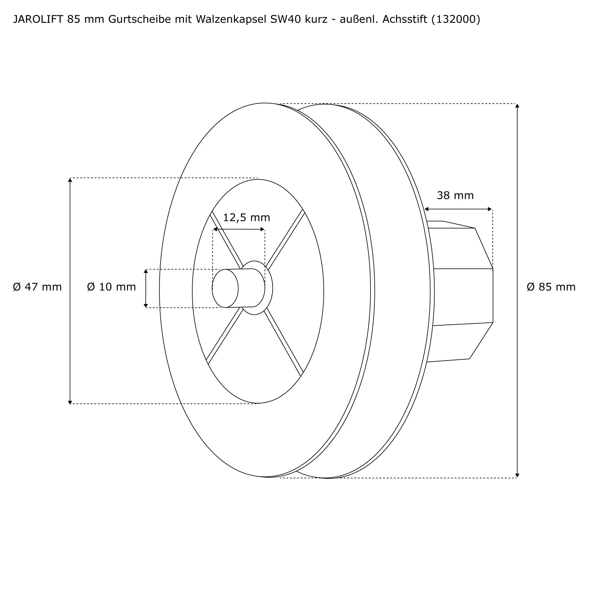 | Produktbezeichnung: | Gurtscheibe mit Walzenkapsel für Rollladenwelle 8-Kant SW40 KURZ | Ø 85 mm / außenl. Achsstift |