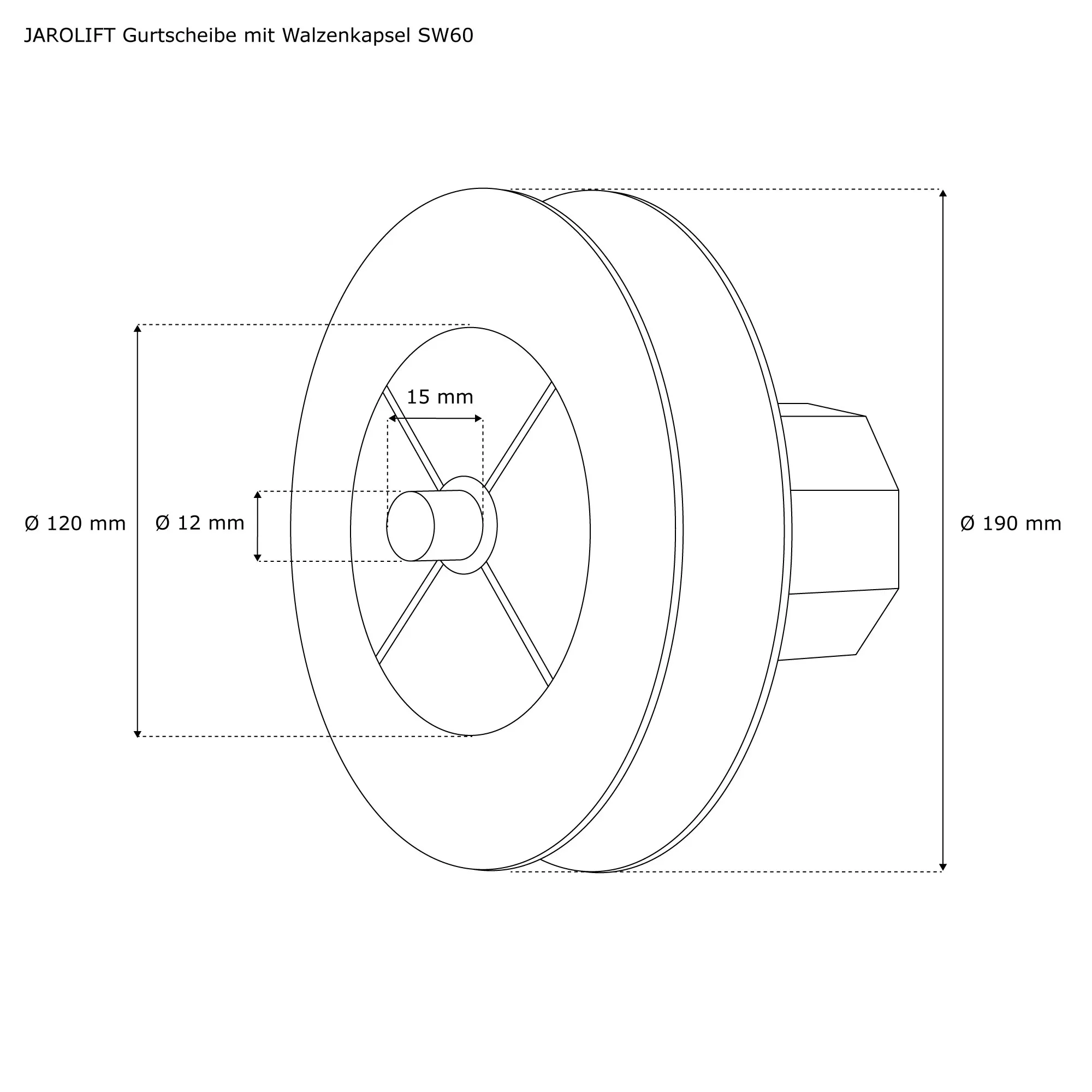| Produktbezeichnung: | Gurtscheibe mit Walzenkapsel für Rollladenwelle 8-Kant SW60 | Ø 190 mm / außenl. Achsstift |