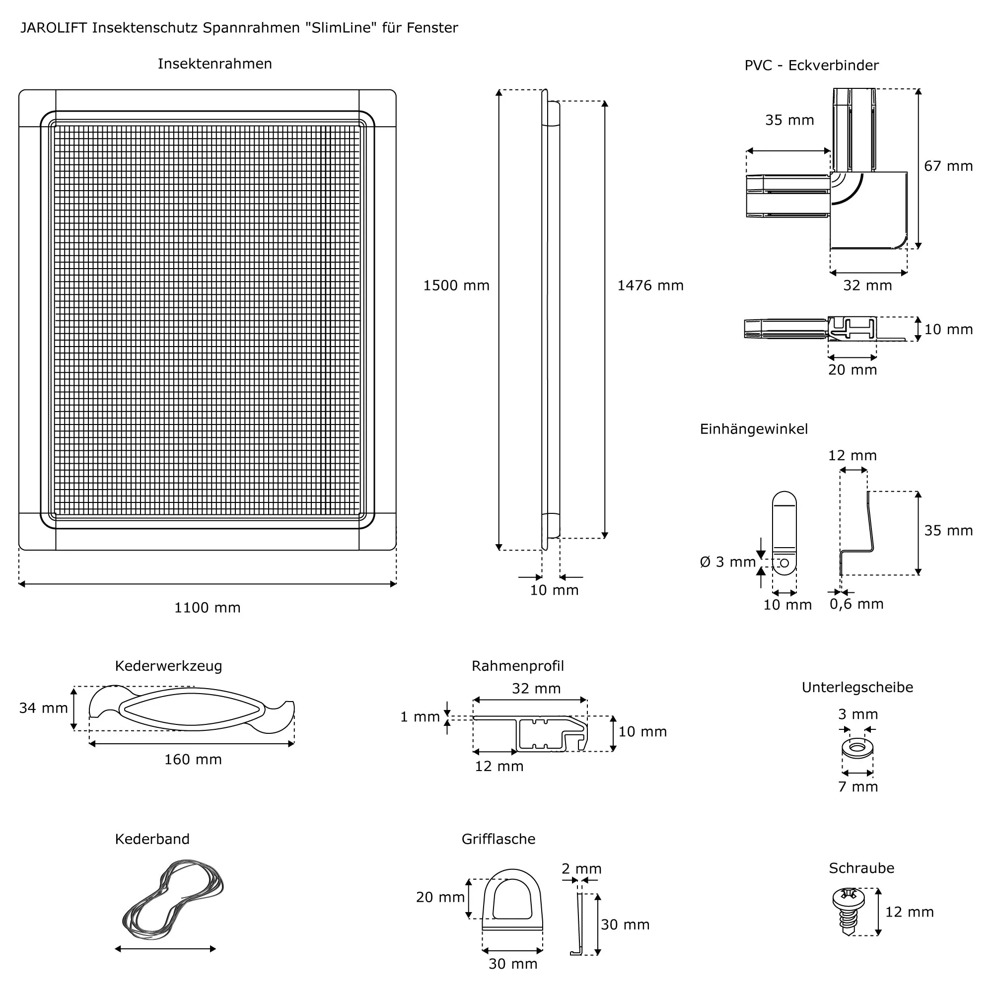 Du erhältsten SlimLine Spannrahmen als kürzbaren Bausatz in 8 verschiedenen Grundgrößen. Im Lieferumfang sind Rahmenprofile, PVC-Eckverbinder, Griffe, Einhängewinkel, das Insektenschutzgewebe und ein Kederband enthalten.