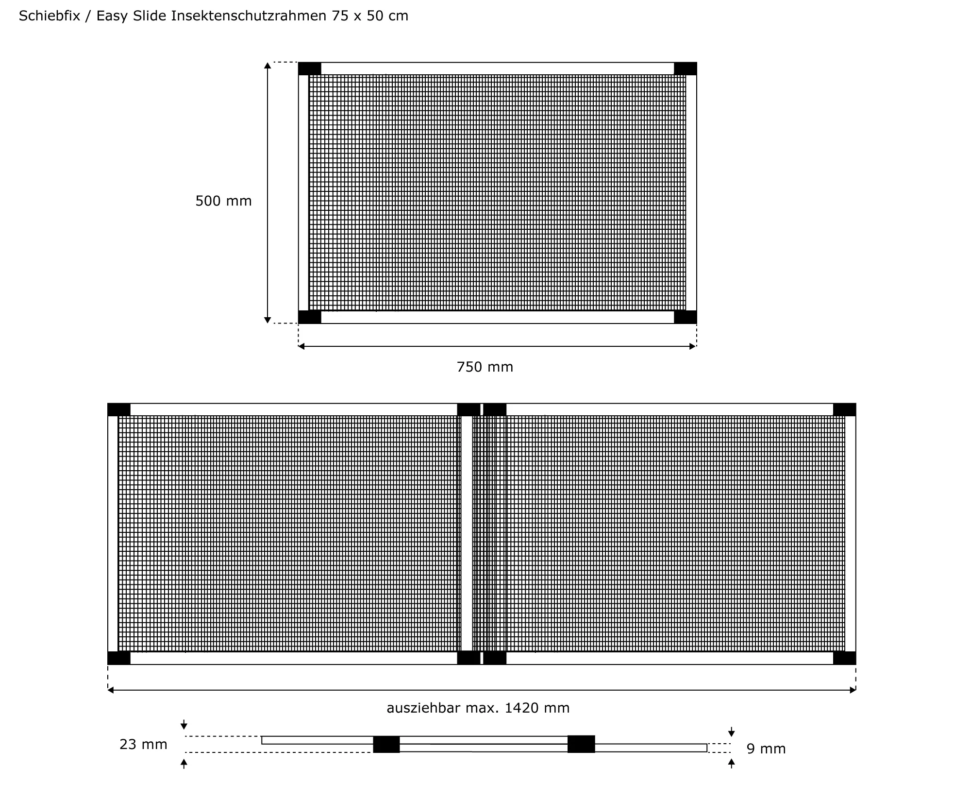 Unseren Insektenschutzrahmen bieten wir in der Größe 75 x 50 cm an. Dein Fenster ist breiter? Überhaupt kein Problem. Der Schiebfix ist je nach Modell ausziehbar bis auf 142 cm und passt sich damit deiner individuellen Fensterbreite an.