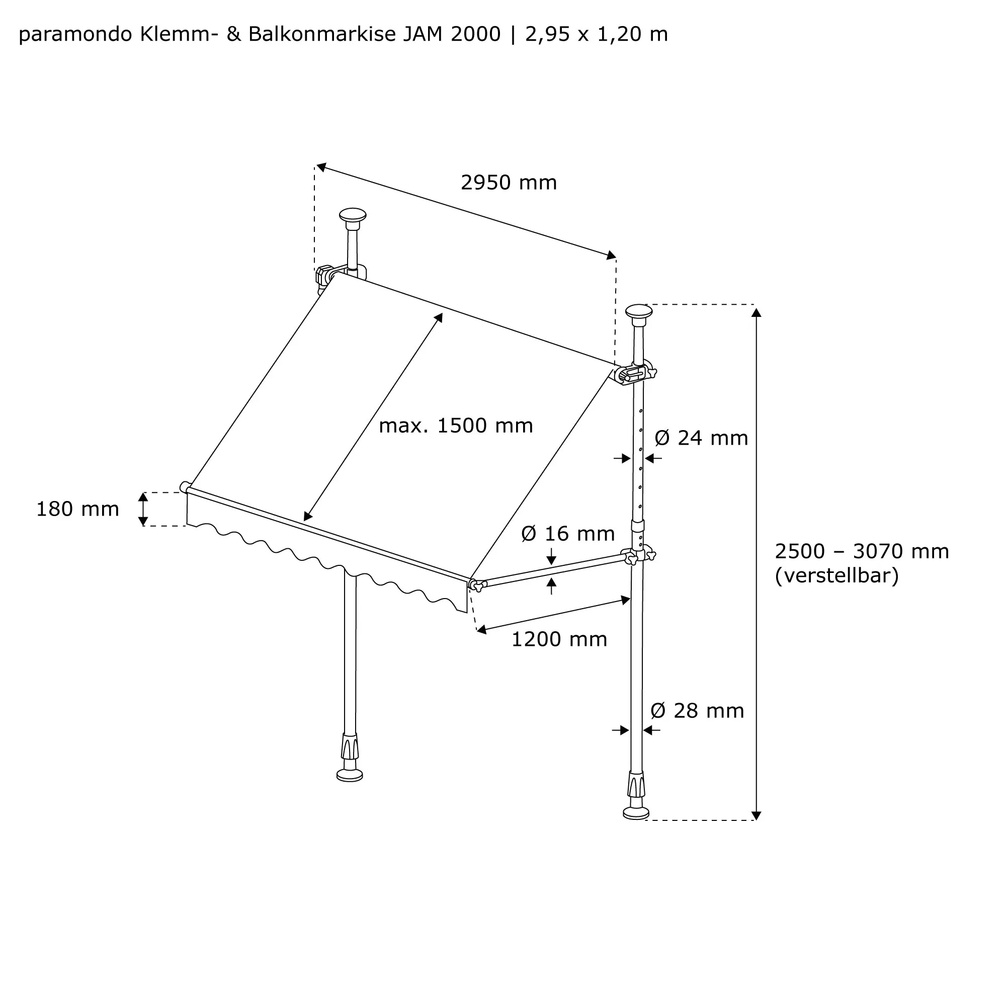 Die JAM 2000 ist eine klassische Klemm-Balkonmarkise. Die Klemmvorrichtung besteht aus zwei Teleskopstangen. Sie sind für einen Abstand von circa 250 cm bis 307 cm zwischen Fixpunkt A und Fixpunkt B – zum Beispiel Boden und darüberliegender Balkon – gedacht. Mit der Kurbel kannst du deine JAM 2000 schnell ein- und ausfahren, und über die Ausfallarme verstellst du unkompliziert den Neigungswinkel. Eine Auswahl an wunderschönen Stoffen runden die JAM 2000 ab.