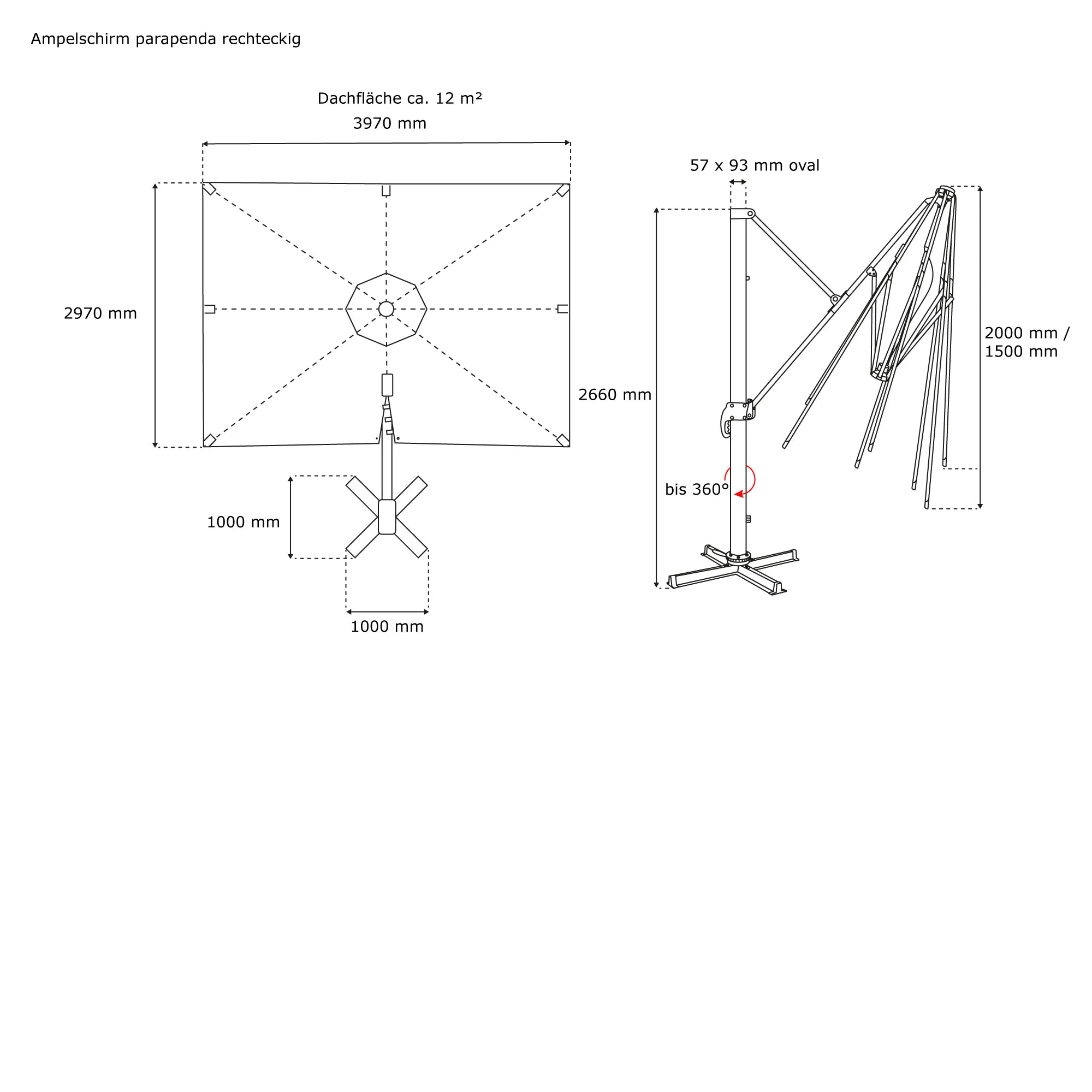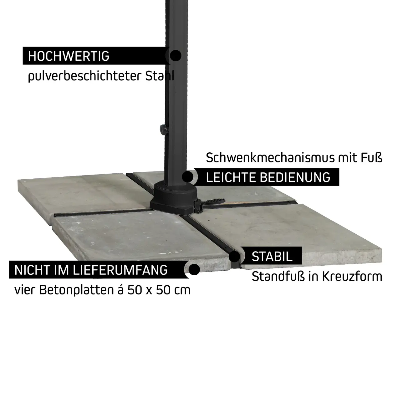 Im Lieferumfang des parapenda ist ein pulverbeschichtetes Stahl-Standkreuz in der ausgewählten Mastfarbe enthalten. Auf dem Stahlkreuz sitzt ein Schwenkmechanismus mit Pedal. Durch das Pedal lässt sich der Schirm per Fuß entsperren, um 360° schwenken und wieder arretieren. Um den Standfuß zu beschweren, benötigst du vier Betonplatten á 50 x 50 cm, die du in die Winkel des Kreuzes legst. Bitte beachte, dass diese Betonplatten nicht im Lieferumfang enthalten sind.