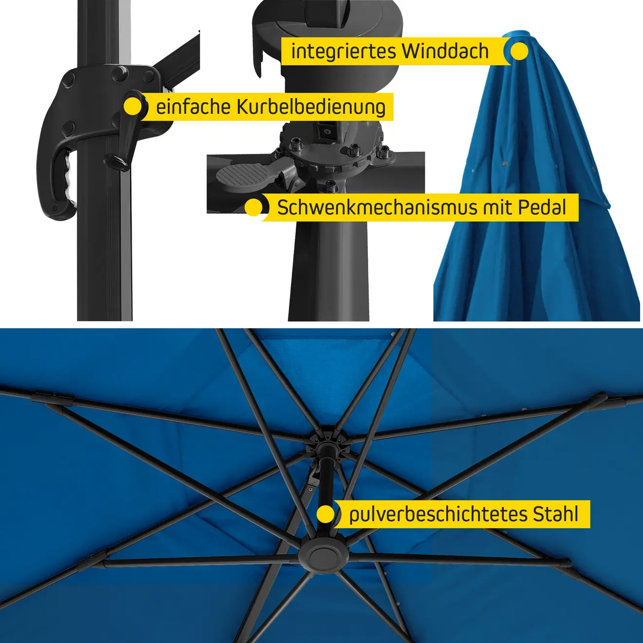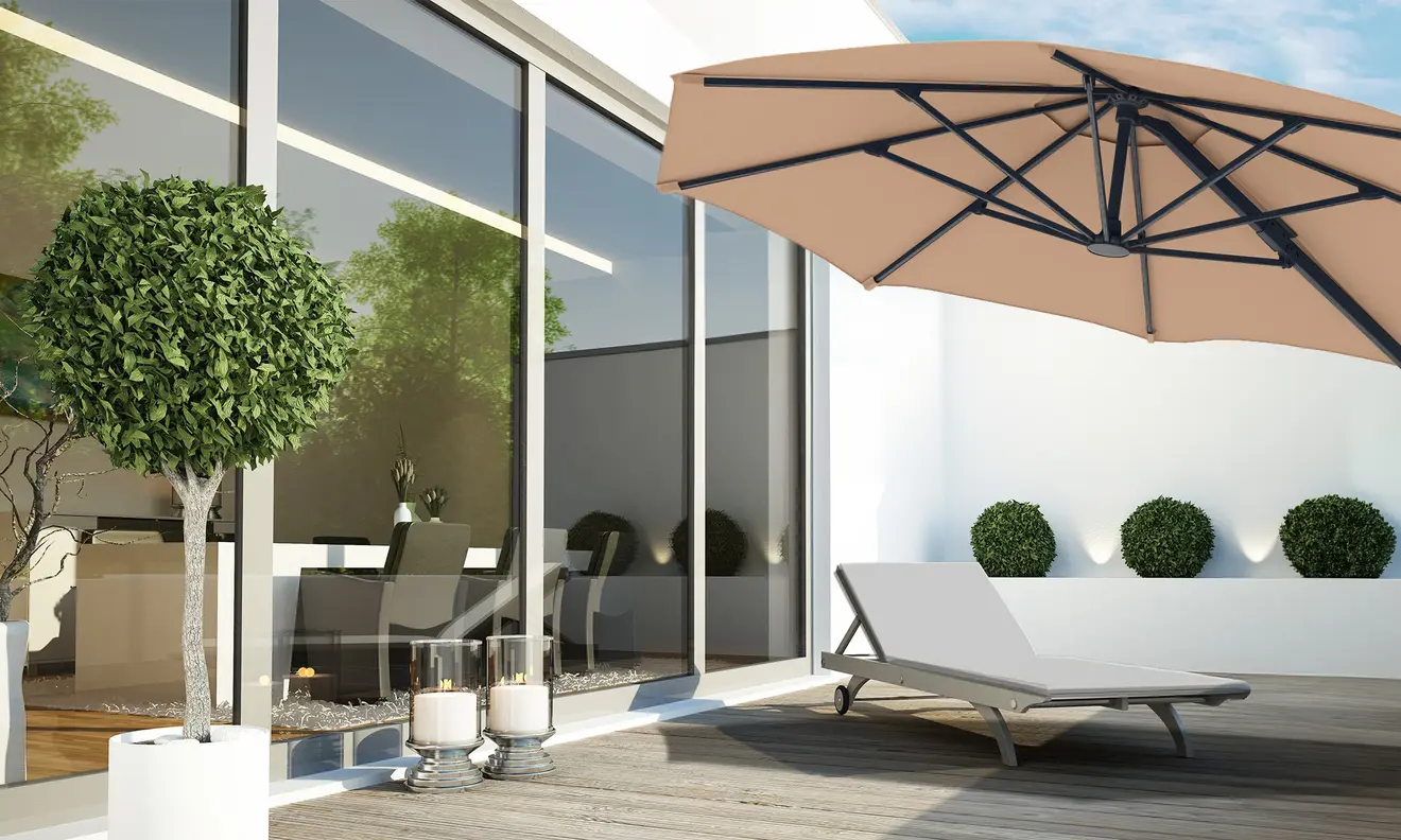 Egal, ob dein Ampelschirm rechteckig oder rund ist: Eine Lüftungsöffnung senkt die Gefahr, dass dein Sonnenschutz durch Winddruck die Balance verliert. Und angestaute Hitze unter dem Schirm entweicht einfach nach oben – so behältst du wirklich einen kühlen Kopf.