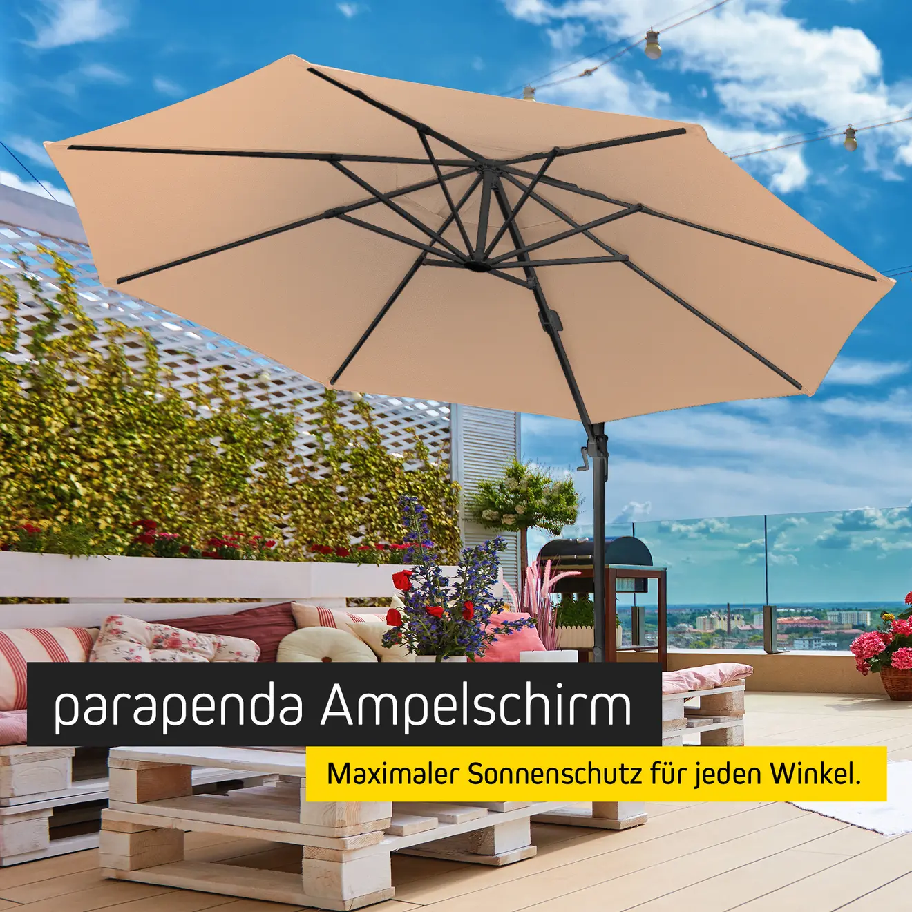 Mit einem parapenda Ampelschirm, rechteckig oder rund, hast du einfach mehr vom Schatten. Anders als bei Schirmen mit einem Mittelstock bieten Ampelschirme, manchmal auch Pendelschirme oder Schwenkschirme genannt, durch die seitliche Positionierung des Schirmmastes eine effektiv nutzbarere Schattenfläche – besonders praktisch für Liegestühle und Tische, da sie durch den Mast keinen Schatten vergeuden.