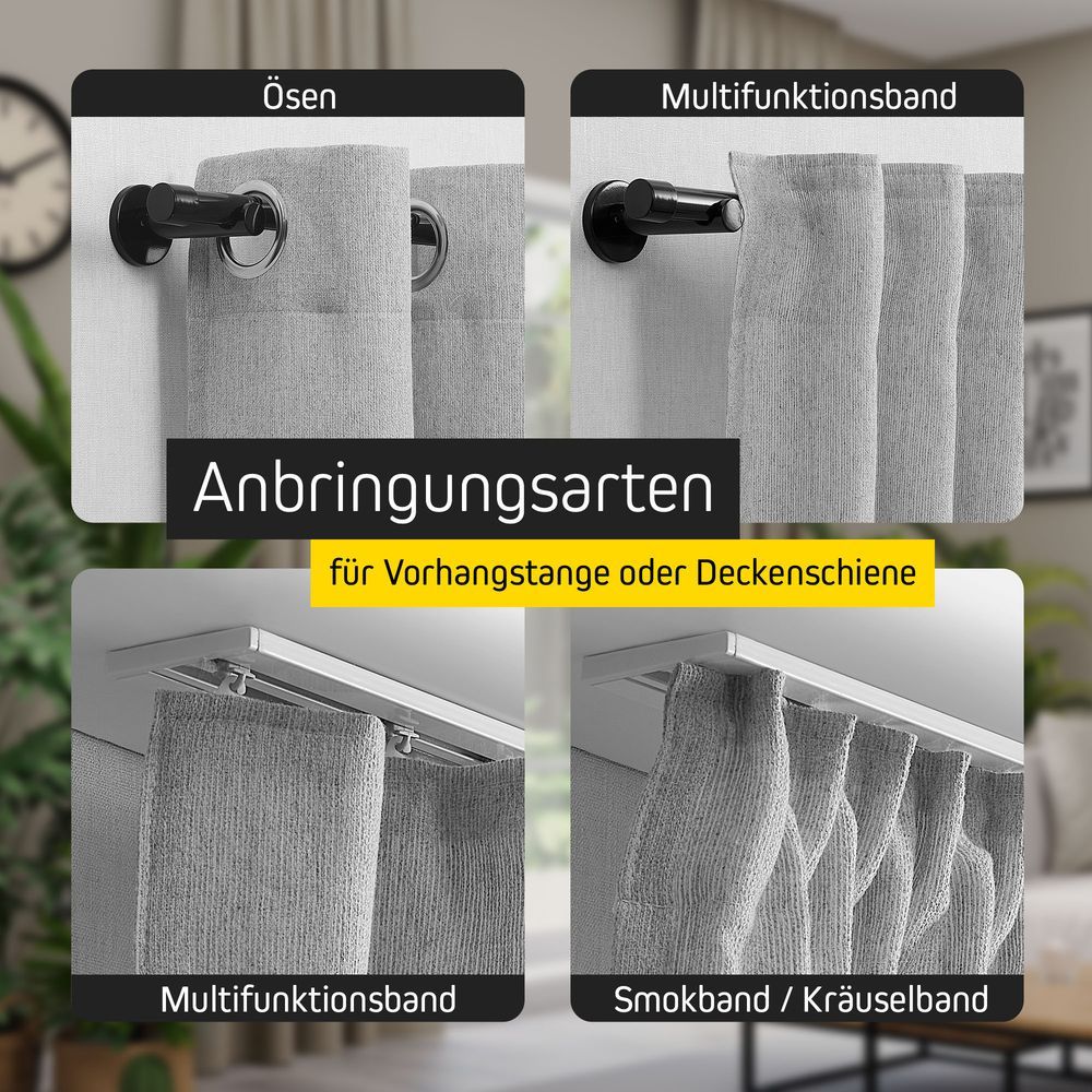 | Aufhängungsart: | Kräuselband, Multifunktionsband, smokeband, Ösen |