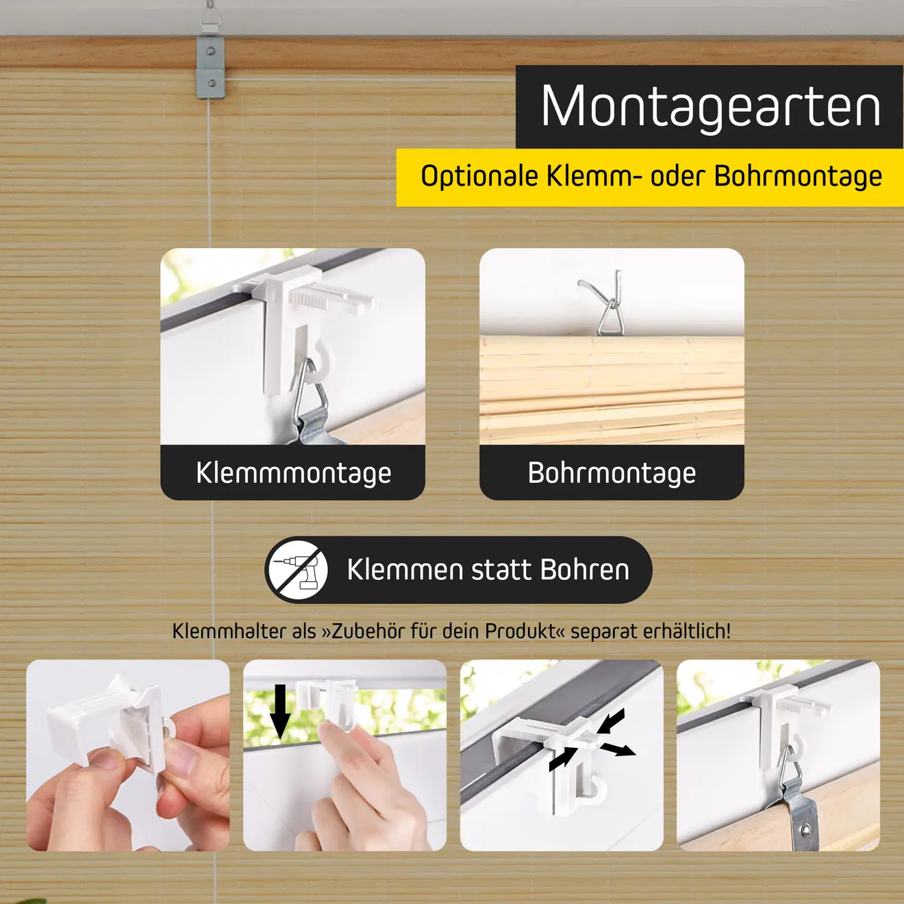 Der Bambusrollo kann entweder wie gewohnt gebohrt und verschraubt werden oder mit den als optionales Zubehör erhältlichen Klemmhaltern bequem und einfach an den Fensterrahmen geklemmt werden.