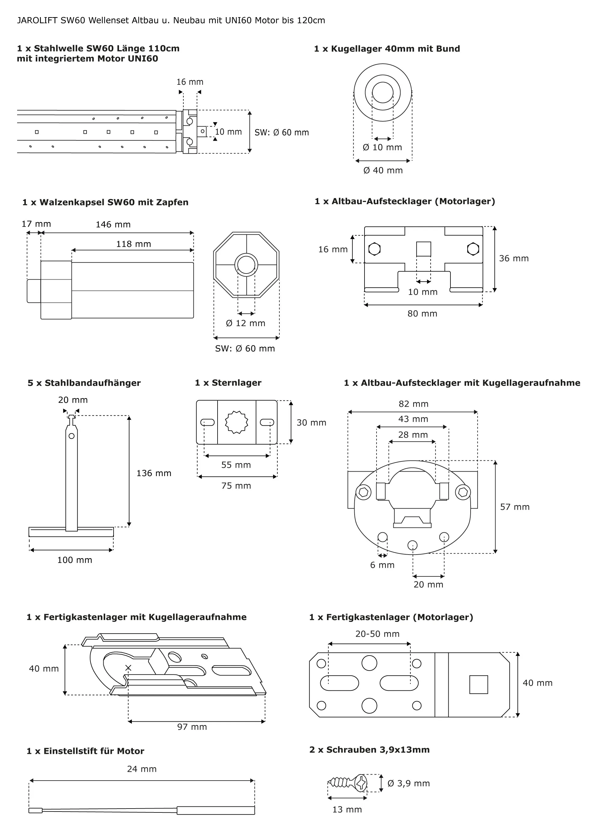 | Produktbezeichnung: | Wellenset Universal-Motor | SW60 / für alle Rollladenkästen bis 120 cm |
